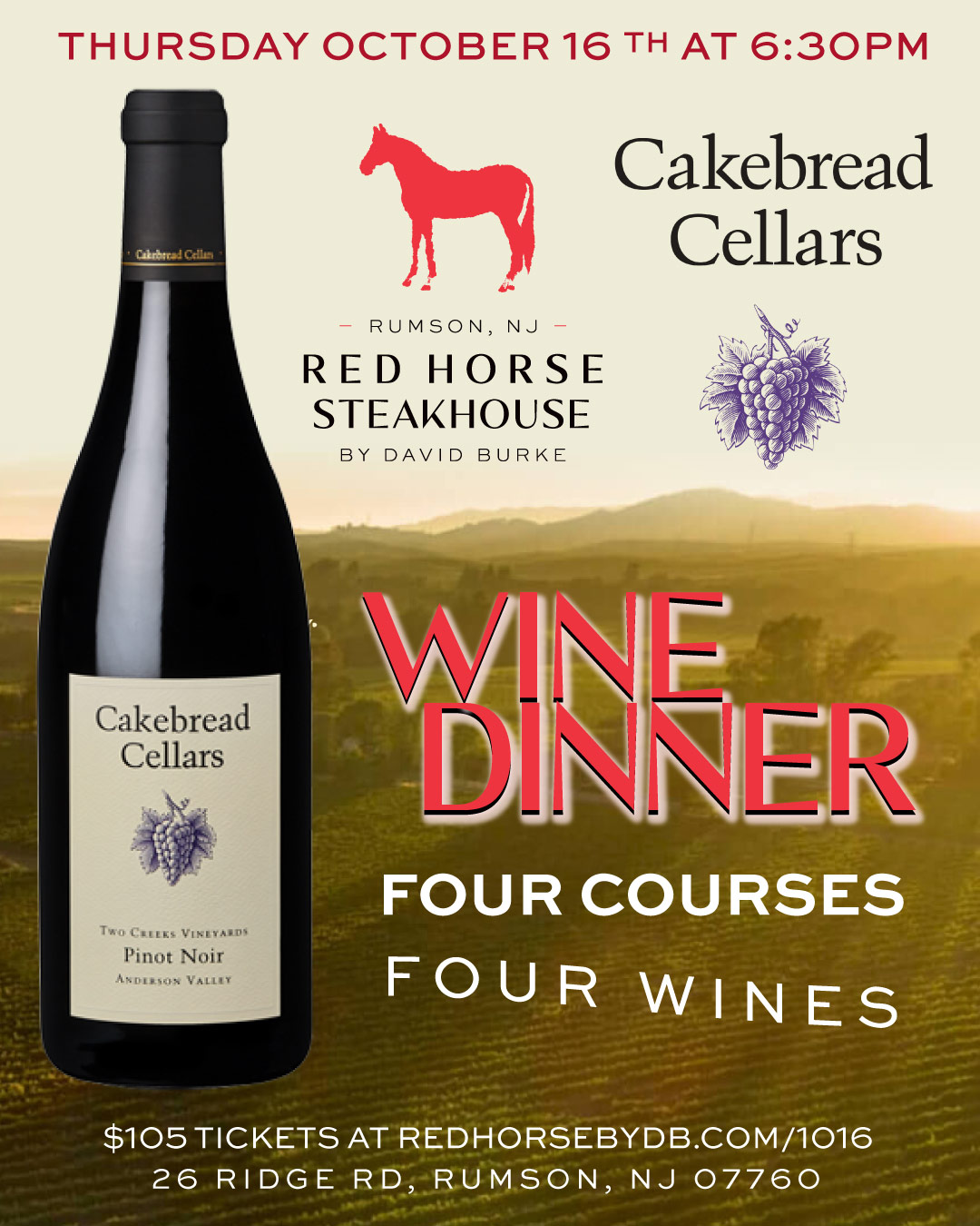 Red Horse by David Burke – Rumson, NJ presents a menu pairing Autumn flavors with Cakebread Cellars Wines from Napa Valley. We’d love for you to join and meet other wine lovers! This is a seated multi-course dinner with dessert, presentations of wines at each course and a brief Q&A.