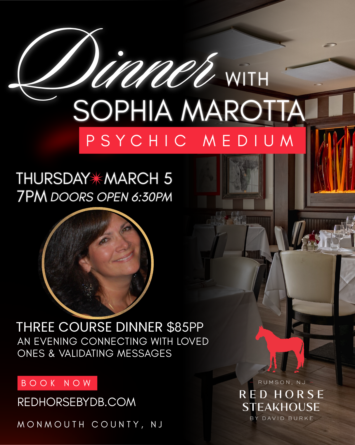 3/5 Three Course Dinner with Celebrity Medium: Sophia Marotta Mar 5 7:00 pm - 10:00 pm 3/5 Three Course Dinner with Celebrity Medium: Sophia Marotta $85.00